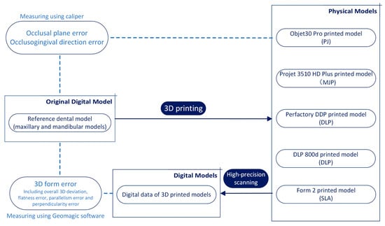 In modern dentistry scenarios, 3D-printed dental models have become increasingly valued by clinical practitioners [3], and 3D-printed dental models have been widely used in orthodontics, prosthodontics, and other disciplines. Although traditional plaster models meet current clinical demands, these models are fragile and require a great amount of storage space [4]. With intraoral and extraoral scanning devices emerging, easy access to digital dental models provides a perfect solution to these problems and, moreover, it revolutionizes the treatment process by virtue of dedicated digital software. For the purpose of converting digitized dental models into physical models, which is still indispensable in many clinical situations, photo-curing 3D printing has become the most frequent manufacturing method used. A key requirement for 3D-printed dental models is accurately replicating the surface morphology of a patient’s teeth and surrounding soft tissues [5,6]. However, polymerization-induced shrinkage can cause internal stress in printed dental models, which will result in strain deformation and, subsequently, in poor dimensional accuracy [7,8]. In addition, the morphological structure design and filling percentage of the model also have a certain influence on its printing accuracy [9,10]. Therefore, many efforts have been devoted to evaluating the accuracy of 3D-printed dental models in the past decade [11]. Even if lots of evaluation results reported are available, whether the accuracy of 3D-printed dental models outperforms that of plaster ones or milled ones is still controversial [12,13,14,15,16,17,18,19,20,21].