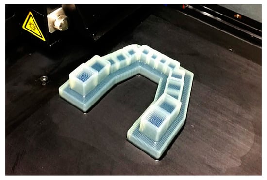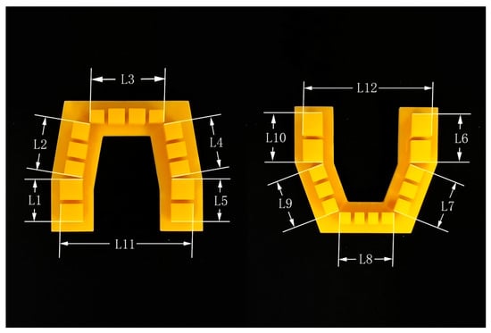 A set of structurized dental models, including a maxillary and mandibular models, was designed in 3ds Max software version 2018 (Autodesk, San Rafael, CA, USA). These virtual structurized models were based on dental crown and arch measurement data from the Chinese population, reported in previous studies [39,40,41,42], and comprised several simple geometrical configurations, which simplified the landmark selection step when performing linear measurements. Simulated dental crowns (SDCs) were cuboids used to simulate the dimensions of real dental crowns. A horseshoe-shaped base was thought to provide a better view of the 3D printer’s performance in terms of reduction in the transverse dimension and is also the mainstream design of 3D-printed dental models [28]. The dimensions of the model are shown in Table 1 and Figure 1.