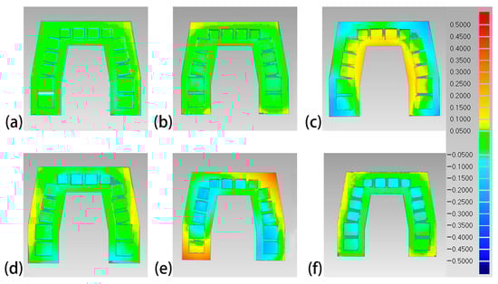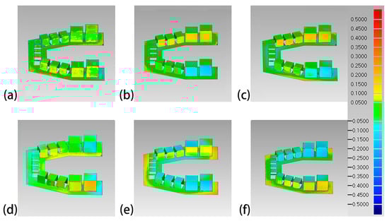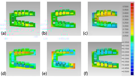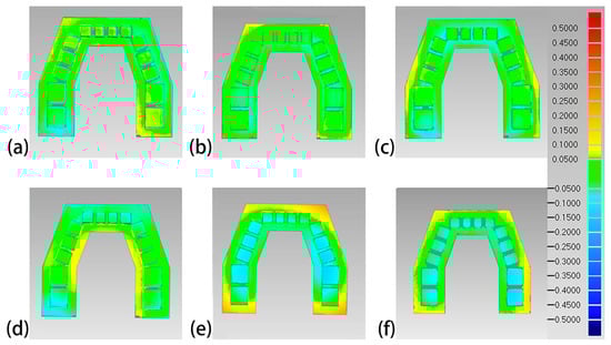 Lateral view of the color difference maps of the printed maxillary models. (a) Objet30 pro; (b) Projet 3510 HD Plus; (c) Perfactory DDP; (d) DLP 800d; (e) Form2; and (f) Form3.