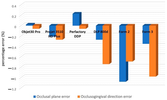 The occlusal plane errors and occlusogingival direction errors of the 3D-printed models (unit: %).