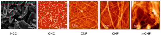 Morphology of different additives, including microcellulose grades characterized by SEM (MCC) and nanocellulose grades characterized by AFM (CNC, CNF, CMF, and mCMF).