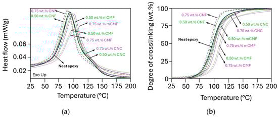 The crosslinking and reaction kinetics of epoxy in the presence of phenalkamine and micro- or nanocellulose additives at selected concentrations (0.5 and 0.75 wt.%) were evaluated with DSC analysis. The exothermal reaction was monitored (Figure 3a), and the degree of crosslinking was calculated (Figure 3b).