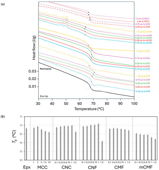 The variations in the Tg for crosslinked epoxy in the presence of phenalkamine with micro- and nanocellulose additives were determined from the second temperature scan in DSC analysis (Figure 4a) and were summarized for different compositions (Figure 4b). The Tg consistently varies depending on the type and concentrations of micro- or nanocellulose additives, indicating different interactions with the epoxy matrix. An increase in the Tg indicates a suppressed motion of the polymer molecules in the case where an additive is promoting the crosslinking, while a decrease in the Tg indicates enhanced mobility of the polymer molecules as the crosslinking is disturbed.
