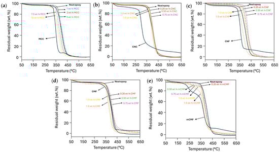 TGA measurements on cured epoxy coatings with different micro- and nanocellulose additives at various concentrations, including (a) MCC, (b) CNC, (c) CNF, (d) CMF, and (e) mCMF.