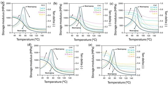 DMA measurements on cured epoxy resin samples with different micro- and nanocellulose additives at various concentrations, representing storage modulus E′ (full lines) and dampening factor tan δ = Ε″/Ε′ (dotted lines), including (a) MCC, (b) CNC, (c) CNF, (d) CMF, and (e) mCMF. Arrows indicate curve shifts as a function of concentration.
