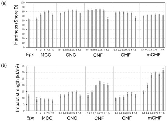Mechanical testing results of epoxy coatings with different micro- and nanocellulose additives at various concentrations (numbers in X-bar represent wt.%), including (a) hardness and (b) impact strength.