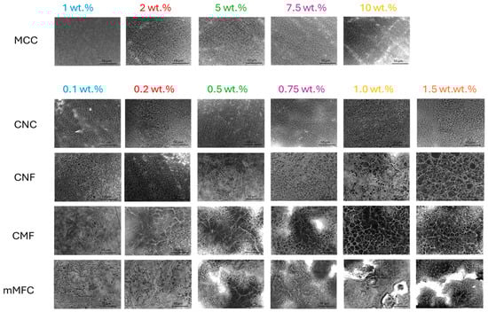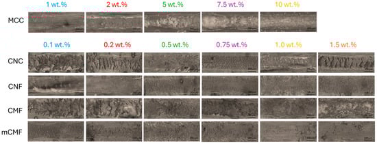 The morphologies of the different nanocellulose grades used in this study were determined by SEM (MCC) or AFM (CNC, CNF, CMF, mCMF), as illustrated in Figure 1. The MCC can be referred to as microcellulose particles. The aspect ratio of the CNC grade is relatively high compared to other types of CNC, while the small fibrillar diameter of CNF indicates more intensive mechanical processing compared to CMF. The characteristics of mCMF with the deposition of styrene–maleimide nanocapsules with encapsulated carnauba wax onto the cellulose surface were fully described before [69]: the interactions between the nanoparticles and cellulose were attributed to hydrogen bonding between the residual anhydride groups of the nanoparticle shell and the hydroxyl groups of nanocellulose.