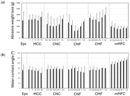 Protective properties of epoxy coatings with different micro- and nanocellulose additives at various concentrations: (a) abrasive wear measured as weight loss under low loads (black bar) and high loads (grey bar) and (b) static water contact angle on unworn coatings (black bar) and after wear under high loads (grey bar).