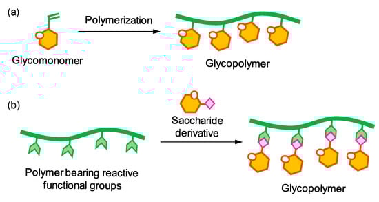 Carbohydrates are one of the most abundant biomass resources and one of the most important biomolecules. Thus, carbohydrate-based functional polymers and materials are candidates for biomaterials [1,2,3]. Various carbohydrate polymers exist, such as natural polysaccharides, synthetic polysaccharides, and saccharide–synthetic polymer conjugates. Glycopolymers, synthetic polymers with pendant saccharide moieties on their side chains, are functional polymers and saccharide–synthetic polymer conjugates [4,5,6,7,8,9,10,11,12,13,14,15,16,17,18,19,20,21,22]. The most important characteristic of glycopolymers is their multivalent binding affinity, called the “glycocluster effect”, in which multiple saccharide moieties are densely packed around a polymer backbone, resulting in stronger binding to receptor biomolecules, such as lectins, viruses, and antibodies [23,24,25]. The synthesis of glycopolymers can be achieved via two processes: the polymerization of glycomonomers and the introduction of saccharide derivatives onto polymer side chains (Figure 1). The polymerization of a glycomonomer is advantageous in that the side chains of the resulting polymers bear saccharide moieties in a reliable and quantitative manner. In addition, various copolymers can be synthesized via copolymerization with other monomers. However, the steric hindrance of the saccharide moieties and the chemical structure of glycomonomers frequently affect the progress of polymerization. This is particularly relevant for large oligosaccharides comprising many monosaccharides. The introduction of saccharide derivatives onto polymer side chains is called “postpolymerization modification” [26,27,28,29,30]. In this method, glycopolymers are synthesized using pre-synthesized polymer backbones bearing reactive functional groups on the side chains through a reaction with saccharide derivatives that can react with and be introduced into the side chains. Sterically small saccharide derivatives, such as monosaccharide and disaccharide derivatives, can be introduced relatively easily. However, excess saccharide derivatives frequently need to be added to the reaction mixture to achieve a quantitatively high saccharide substitution. In addition, when the solubilities of polymer backbones and saccharide derivatives differ, the solvent should be carefully selected. An appropriate solvent that dissolves both the polymer backbone and the saccharide is required.