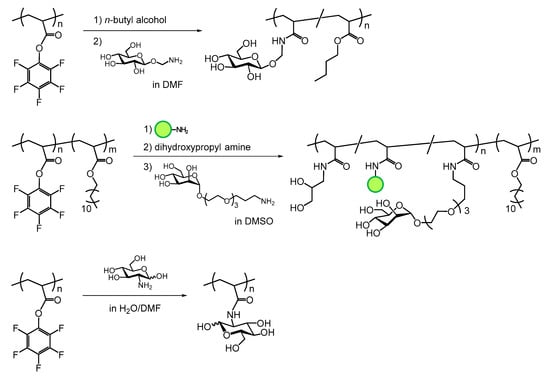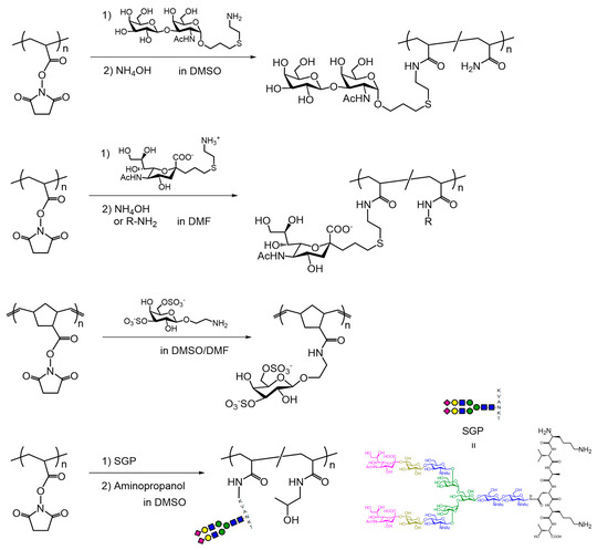 Many researchers have reported the synthesis of glycopolymers by postpolymerization modification using activated esters, such as NHS [74,75,76,77] and PFP [78,79] esters on various synthetic polymer backbones, such as polyacrylamides, poly(metha)acrylates, and polynorbornenes (Scheme 3 and Scheme 4). Polymers bearing NHS and PFP esters have been reacted with amino-group-containing saccharide derivatives to synthesize glycopolymers in DMSO and DMF. The authors reported the synthesis of glycopolymers bearing sialyl-complex-type oligosaccharides using the NHS-bearing polymer and sialylglycopeptide (SGP) in DMSO [62]. The residual activated esters on the polymer side chain generally react with excess amino or alcohol compounds to remove the activated esters after amidation with saccharide derivatives. Amino sugars, such as glucosamine and galactosamine, which bear an amino group at the 2-position, have been used to synthesize glycopolymers [80,81,82,83]. In these cases, the amino sugars functioned as easy-to-use hydrophilic amino compounds to impart hydrophilicity on the resulting polymer products. The solvent in the amidation using glucosamine was DMF-containing water [80].