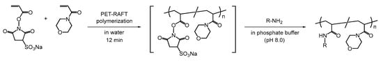 - Tsuji, S.; Aso, Y.; Ohara, H.; Tanaka, T. Polymeric Water-Soluble Activated Esters: Synthesis of Polymer Backbones with Pendant N-Hydoxysulfosuccinimide Esters for Post-Polymerization Modification in Water. Polym. J. 2019, 51, 1015–1022. [Google Scholar] [CrossRef]