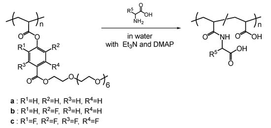 Zhao’s group reported monomers bearing water-soluble activated esters, which were fluorobenzene derivatives with oligoethylene glycol and their polymers (Scheme 8) [111]. These monomers and polymers included compounds with extremely high stability in water (they hardly decompose in water). However, their amidation reactivity with amino groups was low because of their high stability in water. During the postpolymerization modification using excess amounts of amino acids, the degree of substitution reached 10–90% in the presence of Et3N and DMAP under basic conditions. The introduction of papain, a protease, into the polymer side chain has been reported during postpolymerization modification using this polymer in water. Similarly, amino-acid-bearing polymers have been synthesized using activated esters, such as fluorobenzene esters in DMF and water-containing DMSO [112,113].