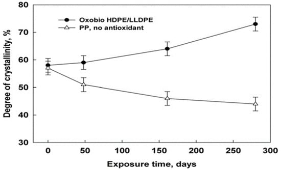 In a study reported by Ojeda et al. [], the abiotic degradability of extruded blown films made from HDPE, LLDPE, PP with low or zero antioxidant additive concentrations, and an HDPE/LLDPE blend with a pro-oxidant additive (oxo-bio HDPE/LLDPE blend) were investigated. The samples were exposed to natural weathering for a year and the thermal and mechanical properties were studied. Figure 1 shows the decreasing crystallinity of the PP samples (without antioxidant) during exposure, whereas the crystallinity of the oxo-bio-HDPE/LLDPE blend was found to increase. These opposing crystallinity patterns were attributed to the decreasing molecular size in the blend and greater amount of impurities in PP. The oxo-biodegradable blend exhibited reduced mechanical properties at a slower rate than both PP and HDPE. This effect is most likely caused by the increased quantity of antioxidants included in the blend, as well as the presence of LLDPE in the mixture. Disintegration was seen after only three months of degradation, and by the 5.5-month point, the mechanical qualities had significantly declined. In general, all films showed a decrease in strength, with PP and the oxo-bio blend sample degrading quickly, followed subsequently by HDPE and LLDPE. The authors concluded that the presence of antioxidant additives did not assist in preventing rapid photo-oxidative degradation, while the presence of a pro-oxidant additive accelerated the samples’ propensity to degrade.