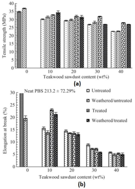 Tensile properties of neat PBS and PBS/teakwood composites: (a) tensile strength; (b) elongation at break [].