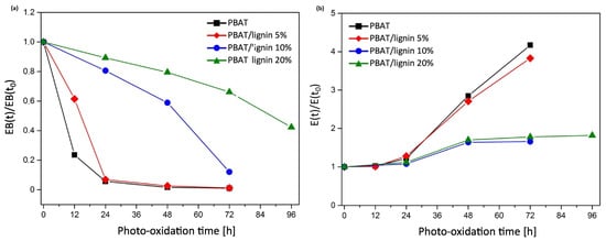 In terms of mechanical performance, Figure 3 depicts the variation of dimensionless elongation at break (defined as the ratio of deformation at break at a given irradiation time-point, EB(t), to that of the unaged samples, EB(t0)) and elastic modulus with photo-oxidation time. After 24 h, a quick decrease in the dimensionless deformation at break was observed for neat PBAT films. In the case of the lignin-containing composites, the decrease was significantly lower. The degradation duration for PBAT was roughly 10 h, during which its characteristics decline by 50%, and it was shown to extend to 90 h for PBAT containing 20% lignin. The dimensionless elastic modulus of all samples increases with exposure duration, which can be attributed to increased crystallisation due to photo-degradation and the development of crosslinks in the amorphous phase, which stiffens the polymer matrix. PBAT reinforced with lignin at 10 and 20% loading showed a slower elastic modulus increase compared to PBAT containing 5% lignin.