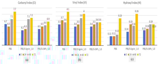 The durability of lignin nanoparticle-reinforced PBS films was studied by Hararak et al. []. The authors observed that after ageing the films, the carbonyl index (CI), vinyl index (VI), and hydroxyl index (HI) of the samples increased with exposure time, as seen in Figure 4a, Figure 4b and Figure 4c respectively. The increase in CI, VI, and HI was attributed to the formation of carboxylic end groups, ketones, hydroperoxide, and hydroxyl products. In the case of lignin-reinforced PBS composites, the CI, VI, and HI values were lower, as the incorporation of lignin delayed the photo-degradation effects.