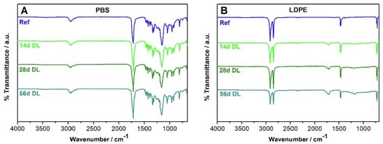 FTIR spectra for PBS (A) and LDPE (B): untreated reference (Ref) samples and those photo-aged to DL for 14, 28, and 56 day (stacked).