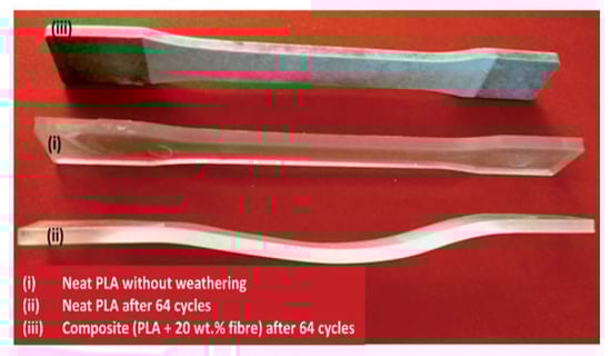The photodegradation effect is dependent on the type of plant fibres used in composites. In an interesting study by Chollakup et al. [], the extent of photodegradation of palm fibre-reinforced PP was found to be less than that of pineapple-leaf fibre (PALF)-reinforced PP. This was attributed to the higher lignin content in palm fibres compared to PALF, providing protecting against photodegradation. The performance of hemp fibre-reinforced PLA biocomposites after multiple cycles of UV exposure of accelerated weathering have been investigated by Sawpan et al. []. It was found that the mechanical properties of the samples were decreased when increasing the test cycles. For composites containing 30 wt% hemp fibres, the tensile strength decreased by 80% after 64 cycles of weathering (768 h). This was attributed to higher levels of water absorption at high fibre loadings, leading to leaching of materials from the fibre and PLA interface and the formation of cracks. As seen in Figure 6, the neat PLA samples exhibited significant warping after 64 cycles of accelerated weathering, while the PLA composites maintained their dimensional stability due to the presence of hemp fibres.