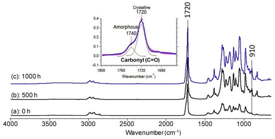FTIR spectra of PHBV films: un-weathered control (a) and weathered for (b) 500 h and (c) 1000 h.