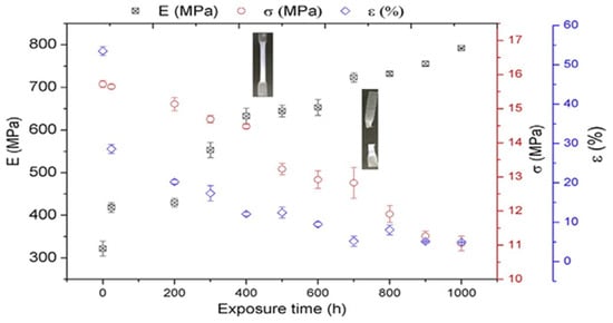 The durability of teak sawdust-reinforced PBS composites was studied by Hongsriphan et al. []. Weathering experiments were carried out as per ASTM-G154 [] for five cycles. It was observed that after weathering for 60 h, there was a slight increment in Young’s modulus and tensile strength of neat PBS; however, the strain values reduced by 94% (Figure 2). The drastic reduction in flexibility indicated deterioration in the amorphous region of the PBS matrix. In the case of composites, similar results were observed, being attributed to the cyclic expansion and contraction of the samples.