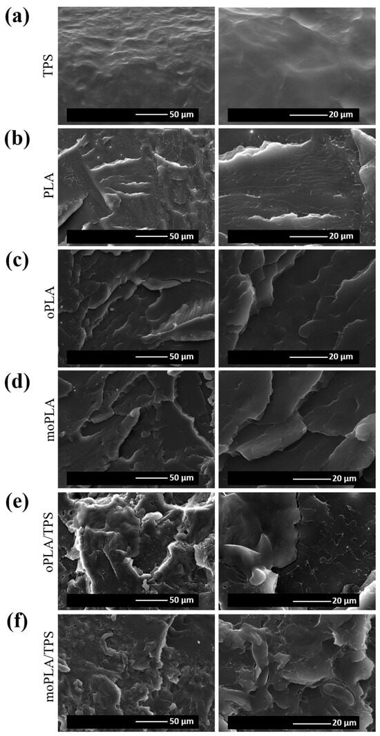 SEM images of neat TPS (a) PLA (b), plasticized PLAs (c,d), and plasticized PLA/TPS blends (e,f).