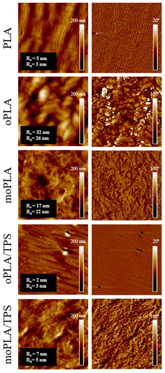 However, the effect of the addition of both OLA8 and mOLA8 on the morphology of PLA/TPS blend was deeply studied by AFM. The obtained AFM height and phase images are shown in Figure 2. The cross-section AFM phase image of PLA indicated its homogeneous morphology, which also confirmed the very low surface roughness of PLA. The addition of OLA8 and mOLA8 into PLA resulted in changes in the morphology observed for PLA. In the case of oPLA, the regular crystalline-like structure with separated domains of around 200 nm was detected while moPLA showed a different regular structure with small spherulites of the size of 400 ± 50 nm. The surface roughness of oPLA was eight times higher than the surface roughness of PLA and moPLA was four times higher, suggesting that both OLA8 and mOLA8 are good plasticizers for PLA.