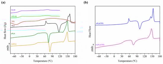 First heating scan of neat materials and plasticized PLAs (a) and their blends with TPS (b).