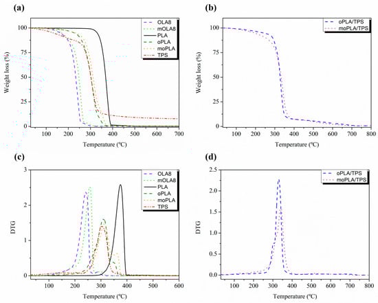 TGA of TPS, PLA, plasticizers and plasticized PLA (a) and blends with TPS (b) and DTG of TPS, PLA, plasticizers and plasticized PLA (c) and blends with TPS (d).