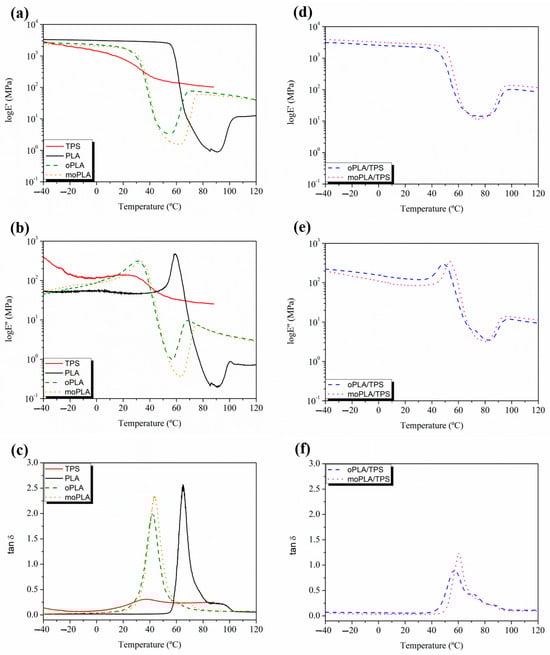 Figure 5 shows the DMTA curves for neat PLA and TPS, plasticized PLAs, on the left and their blends, on the right. The variation in the E’ values of neat PLA (Figure 5a) showed a dramatic drop between 55 °C and 80 °C, which is representative of the relaxation process of the PLA chains due to the glass transition temperature. A second transition is observed at around 110 °C that reflects the cold crystallization of PLA. Adding both plasticizers, the E’ curves and consequently their drop, shifted to lower temperatures indicating a decrease in Tg and the Tcc, as previously observed by DSC analysis. Furthermore, the addition of both plasticizers leads to a broadening of the Tg peak (Figure 5b,c) indicating a wide range of relaxation times. Moreover, the E’ values decreased with the addition of both plasticizers, suggesting a decrease in rigidity and an increased ductility of the materials. More accurate Tg values can be obtained by determining the peak maximum of tanδ and loss modulus (Figure 5b,c). Observing the tanδ curve, neat PLA showed a Tg of 65 °C and the plasticized PLA reached the values of 44 °C and 42 °C for moPLA and oPLA, respectively. These results are in agreement with the results obtained by the DSC characterization.