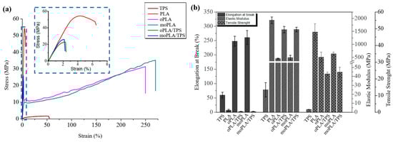 (a) Stress vs. strain diagrams for neat PLA and TPS, plasticized PLAs, and their blends with TPS. (b) Summary of the mechanical properties.