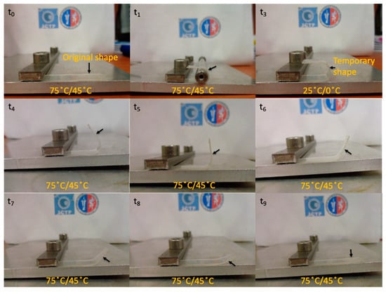 Moreover, when the plasticized PLA-based materials are blended with TPS, they are able to considerably increase the elastic modulus, slightly decrease their tensile strength, and dramatically drop down the elongation at break reaching values similar to that of neat PLA. Finally, the effect of the PLA plasticization and the compatibilization of its blends with TPS on the thermally-activated shape memory properties were studied in order to evaluate if these materials can overcome the PLA limitation and open up its potential application in biomedical field []. Therefore, knowing the morphology of the materials as well as their mechanical and thermal properties, and considering that in general a Ttrans ≈ Tg + 15 °C [,] is shown to study the thermally-activated shape memory response, we chose two different transition temperatures, one for neat PLA and one for the plasticized systems, closer to the human body temperature. In particular, the shape memory of neat PLA was thermally-activated at 75 °C while that of plasticized PLA-based materials and their blends with TPS was activated at 45 °C for comparison. A visualization test, Figure 7, of the thermally-activated shape memory properties of neat PLA was done by bending the sample at the Ttrans in the temporary shape then fixed at room temperature and recovered at the same temperature. The mechanism proposed involved a permanent network, composed of PLA chains physically entangled or linked thanks to the PLA crystals, able to memorize the permanent shape and store the driving energy needed to recover it. On the other hand, the switching phase, characterized by the Ttrans, is formed by the amorphous PLA chains which can be frozen below their Tg in order to fix the temporary shape and reheated above their Tg to gain high mobility and activate the recovery of the permanent shape.