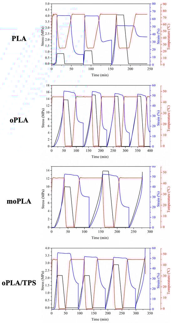 The stretched state was maintained after quenching and subsequent removal of the stress at the same temperature. Finally, the recovery of the permanent shape was activated at the Ttrans. Figure 8 presents the evolution of strain, stress, and temperature in function of time during the dual-shape memory programming step for all the materials. The results related to the sample moPLA/TPS at 45 °C are not shown because it was not possible to perform the thermo-mechanical cycle due to the breaking of the sample.