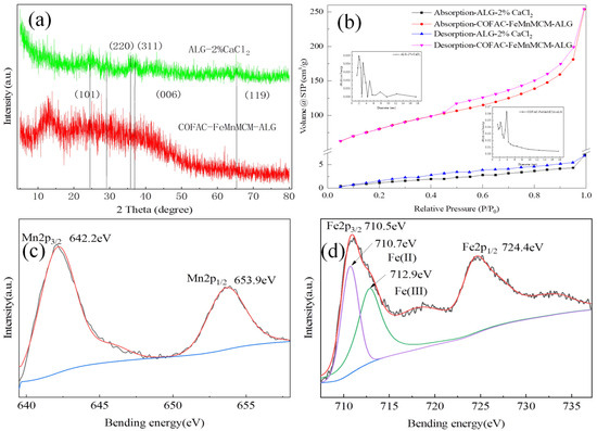 (a) XRD patterns and (b) N2 adsorption and desorption isotherms and pore-size distribution diagram for ALG-2%CaCl2 and COFAC–FeMnMCM–ALG composite beads; (c,d) XPS analysis of COFAC–FeMnMCM–ALG.