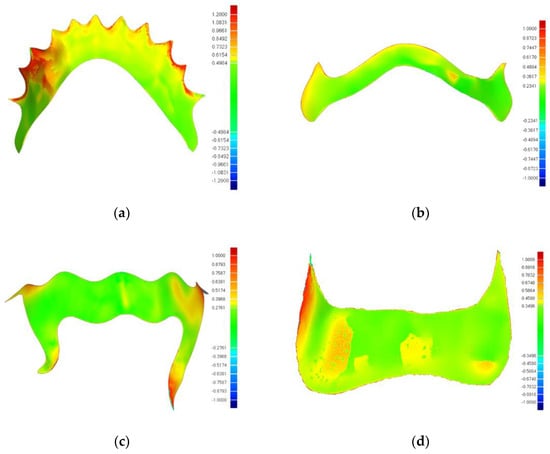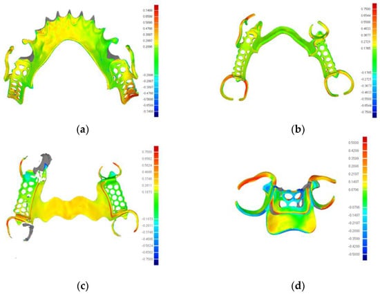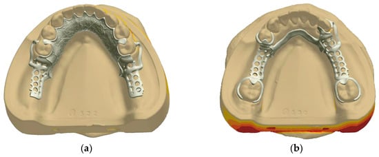 26]. The analysis showed that the traditional RPD framework had the best suitability (deviation 27 ± 40 μm), and the CAD-CAM framework had a slightly lower suitability (150 ± 13 μm), both of which successfully met the clinical requirements. Ye et al. carried out a quantitative analysis on the suitability of an integrated PEEK RPD, designed and fabricated by CAD-CAM technology, measuring the base, large connector, and overall suitability. The integrated RPD of PEEK (overall deviation 42.8 ± 29.4 μm) showed superior suitability compared with the traditional cast metal RPD [