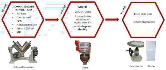 To prepare the fresh mortars, a combination of air lime, sand, starch-based additive, the corresponding PCM, and an initial 0.25% bwol of superplasticizer were mixed using a solid additives mixer BL-8-CA (Lleal, S.A., Granollers, Spain) for 5 min (Figure 2), ensuring a uniform powder blend. In all instances, the weight ratio of binder to aggregate was maintained at 21.7/78.3. Subsequently, 25% wt/wt of the mixing water was added at low speed over 270 s using a Proeti ETI 26.0072 mixer (Proeti, Madrid, Spain). Gradual increments of 0.25% bwol of superplasticizer were introduced until the desired fluidity (175 ± 20 mm) was achieved and proper adhesion of the monolayer on an absorbent saturated brick surface, based on the judgement of a specialized technician in mortar production and application (Figure 2).