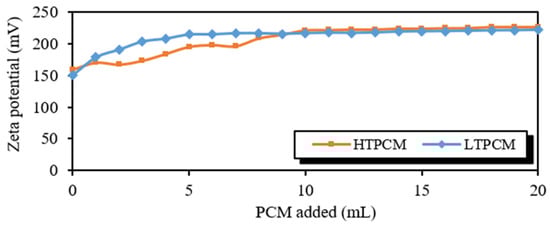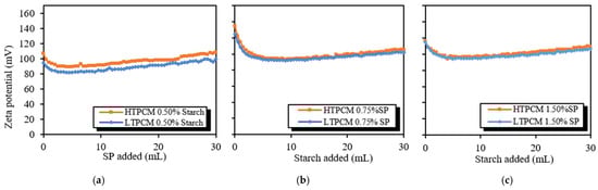 Zeta potential measurements were carried out on the PCM-lime systems with the simultaneous presence of both the superplasticizer and the starch derivative (Figure 6). First, the PCM-lime system with an initial amount of 0.50% of the starch additive was studied. This system was titrated with superplasticizer to study the interaction of both chemical additives (Figure 6a). The behavior was very similar for the systems with either HTPCM or LTPCM; irrespective of the type of PCM tested, an asymptotic stabilization was observed at high and positive values of zeta potential, indicating the absence of incompatibilities. The lower values of zeta potential observed during the titration with the superplasticizer compared to those reported in Figure 5a could be due to the initial adsorption of starch onto the lime particles, which reduced the number of deprotonated lime particles shielded by calcium ions. Similar results were obtained in experiments conducted in PCM-lime initially including two different percentages of superplasticizer (0.75 and 1.50%) titrated with the starch additive (Figure 6b,c). The disappearance of the maxima observed in Figure 5b was ascribed to the previous adsorption onto lime particles of the superplasticizer, preventing the formation of the second adsorption layer.