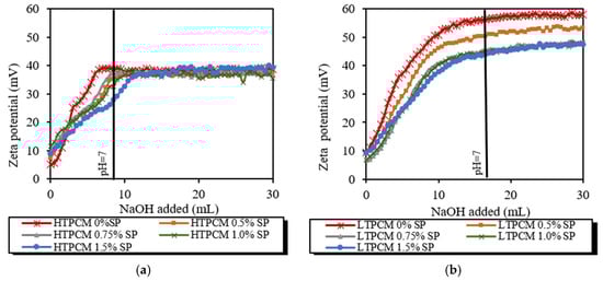 Zeta potential measurements performed on 5% wt/wt aqueous suspensions of HTPCM or LTPCM with different percentages of superplasticizer are gathered in Figure 4a,b. It was observed how pH clearly affects the charge of the microparticles, probably by deprotonating the melamine. At acidic pH, with little NaOH added, the positively charged protonated melamine is shielded with negative anions responsible for the low zeta potential. As the medium is alkalinized, the negative charge resulting from the deprotonation of the melamine is shielded in the stern layer by cations, responsible for the positive zeta potential, until complete deprotonation, thus reaching an asymptotic curve. Furthermore, the polymeric superplasticizer might employ hydroxyls to deprotonate their carboxyl groups instead of deprotonating the melamine of the microcapsules. This clarified why achieving a high positive zeta potential takes more time, or may not be attained at all, with higher dosages of this chemical additive. In all instances, zeta potential values above 30 mV were obtained at alkaline pH (Figure 4a,b), which indicated a predominance of electrostatic repulsive forces leading to monodispersity with no tendency to agglomerate []. Higher zeta potential values can be observed for the LTPCM suspensions indicating higher stability (Figure 4b). The higher zeta potential values for this phase change material can be also related to the higher average diameter of LTPCM (ca. 30 microns) as compared with the HTPCM (ca. 20 microns), which resulted in higher charge surface per microsphere of the PCM. This was confirmed by the requirement of a higher amount of NaOH to fully deprotonate the melamine shield and to reverse the pH from acidic to alkaline values.
