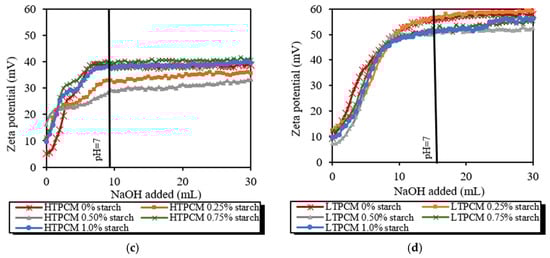 Zeta potential values of 0.02 M NaOH titration of either increasing SP dosages in (a) 5% wt/wt HTPCM, (b) 5% wt/wt LTPCM; or increasing starch dosages in (c) 5% wt/wt HTPCM and (d) 5% wt/wt LTPCM suspensions.