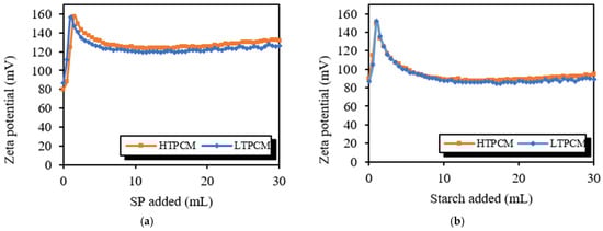Zeta potential values of 5% wt/wt lime, 5% bwol PCM: (a) titrated with 1% wt/wt SP and (b) titrated with 1% wt/wt starch.
