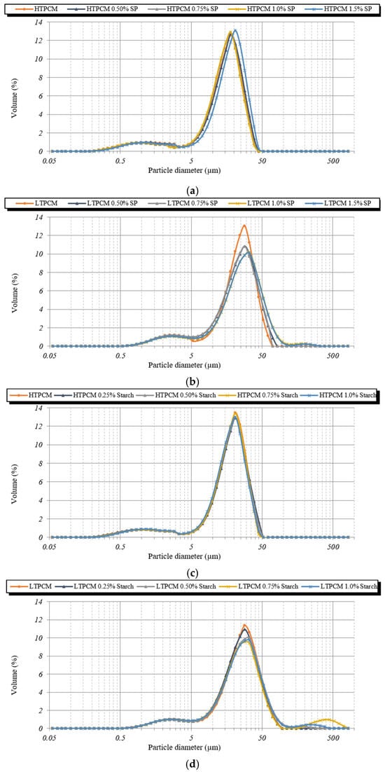 Particle size distribution of 5% wt/wt lime, 5% bwol of PCM with either increasing superplasticizer dosages in (a) 5% bwol HTPCM, (b) 5% bwol LTPCM; or increasing starch dosages in (c) 5% bwol HTPCM and (d) 5% bwol LTPCM suspensions.
