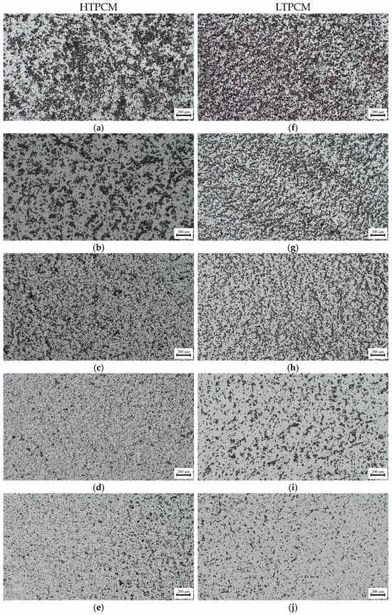 Optical micrographs of PCM-lime suspensions (from top to bottom) with 0, 0.50, 0.75, 1.0, and 1.5% bwol of superplasticizer; (a–e) corresponds to HTPCM and (f–j) to LTPCM. All images were captured at 5×.