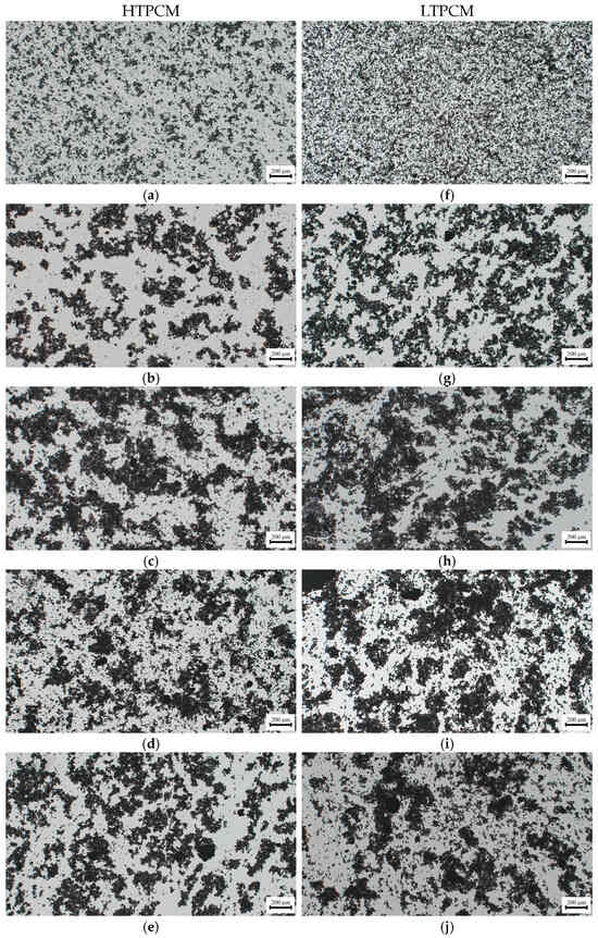 Optical micrographs of PCM-lime suspensions (from top to bottom) with 0, 0.25, 0.50, 0.75, and 1.0% bwol of starch; (a–e) corresponds to HTPCM and (f–j) to LTPCM. All images were captured at 5×.