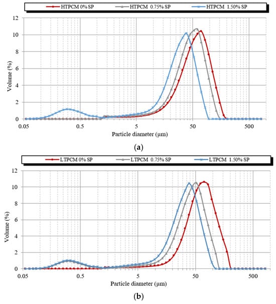 Particle size distribution of 5% wt/wt lime, 5% bwol of PCM, 0.50% bwol of starch with increasing superplasticizer dosages suspensions: (a) HTPCM and (b) LTPCM.