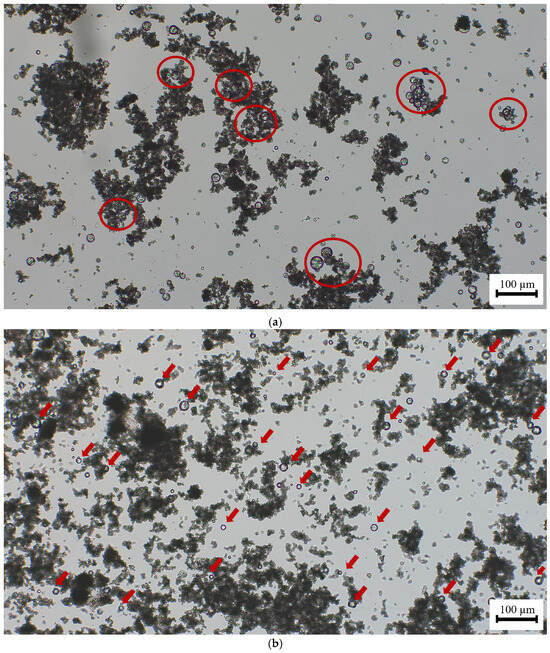 On the other hand, upon addition of the starch-based polymer, a shift towards greater particle sizes was clearly observed (Figure 7c,d), proving the flocculant action of this polymeric additive []. This flocculant effect of the adhesion booster was also confirmed via optical microscopy (Figure 9).