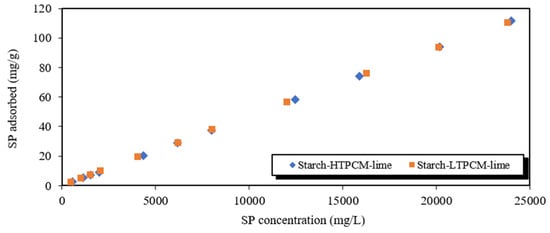 Adsorption isotherm curves of superplasticizer onto starch-PCM-lime.
