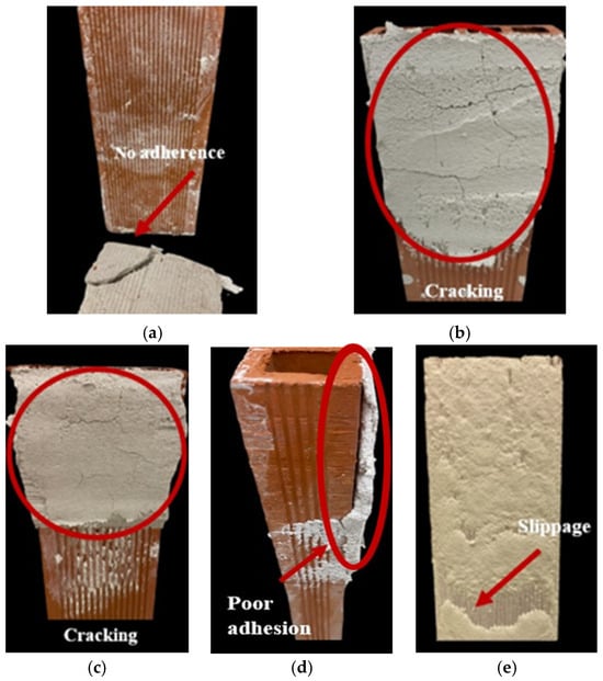 Rendering on saturated brick of mortar: (a) containing 10% PCM and 0.45% SP, (b) containing 0.35% SP, (c) 0.25% starch and 0.40% SP (frontal), (d) 0.25% starch and 0.40% SP (side face), and (e) 1.25% bwol of SP. All percentages of the additives refer to by weight of lime.