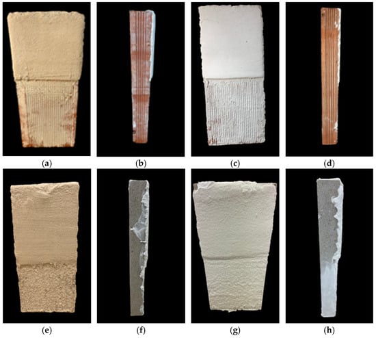 Following the attainment of the ideal composition for each render, single-layer mortars were also investigated on a natural substrate, specifically sandstone. This examination resulted in excellent adhesion and the absence of any crack formation, as depicted in Figure 15e–h. Remarkably, optimized renders exhibited exceptional performance despite variances in both the chemical composition and porosity of the substrates employed (Figure 15). The refined formulations have been compiled in Table 4, detailing the proportions of additives utilized for each type, along with the respective percentage of PCM included.