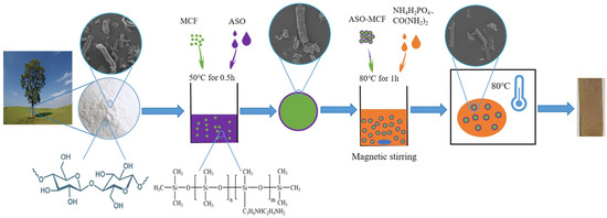 Secondly, ASO-MCF was dispersed in distilled water to prepare a suspension of 4 wt%, and appropriate amounts of NH4H2PO4 and urea were added to the suspension with magnetic stirring at 80 °C for 30 min, in which ratio of anhydroglucose units of microcellulose (AGU) chain to reagents being: 1:1.2:4.9. Afterwards, the mixture was filtered and completely dried in a constant temperature electric oven dried at 105 °C. Finally, the ASOP hybrid modified materials were re-dispersed into deionized water (0.5 wt%), washed twice, and its pH was adjusted to 9.5 using 0.1 M sodium hydroxide solution, then filtered and dried to constant weight, labeled as ASOP-MCF, and the modification process is shown in Figure 1.