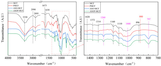 FTIR analysis allows the assessment of the structural changes occurring at different treatment stages, and it is an effective method for demonstrating the presence of silane and phosphate groups in ASOP-MCF. As shown in Figure 2, all samples showed characteristic peaks of microcellulose fibers. Among them, the peaks in the regions of 3330 and 1630 cm−1 were O-H group stretching vibration and bending vibration [21,22]. The peaks at 2990, 2895, and 1673 cm−1 corresponded to antisymmetric stretching of the -CH2 group [23], C-H symmetric stretching of the aldehyde group, and C=O stretching vibration of the microcellulose chain, respectively. Notably, the C=O bonding was not observed in the MCF, which indicated that partial oxidation occurred in the modified MCF. The characteristic peaks observed at 1428, 1372, and 1314 cm−1 are CH2 symmetric bending, C-O symmetric stretching or C-H asymmetric deformation, and C-H bending of microcellulose molecules, respectively [24]. In addition, the characteristic peaks at 1160, 1110, and 896 cm−1 were related to C-O-C asymmetric stretching, C-O pyranose ring skeleton vibration, and C-H rocking vibration of microcellulose molecules. It is noteworthy that the characteristic peaks at 1428, 1372, 1160, and 1110 cm−1 were found in all the samples. At the same time, these bands belong to the characteristic of cellulose I structure [25], which is consistent with the XRD results.