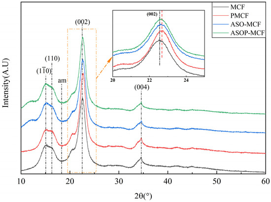 The crystal structure and crystallinity index of all the samples (MCF, ASO-MCF, PMCF, and ASOP-MCF) were tested and analyzed using XRD. All samples exhibited four diffraction peaks at 2θ = 15.0, 16.4, 22.6, and 34.5° corresponding to the crystallographic planes of cellulose I structure (10), (110), (002) and (004), respectively [31,32,33], and the peaks were shifted to the right at (002) after modification of microcellulose. as shown in Figure 3. These results clearly indicated that the modifier species did not change the crystal structure of the microcellulose molecules.